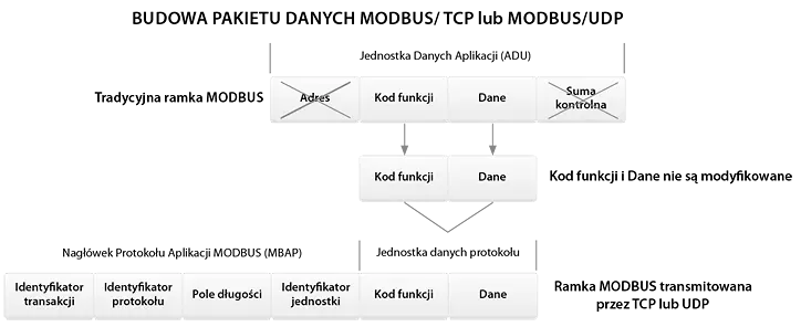 Enkapsulacja pakietu MODBUS została zobrazowana na poniższym schemacie: