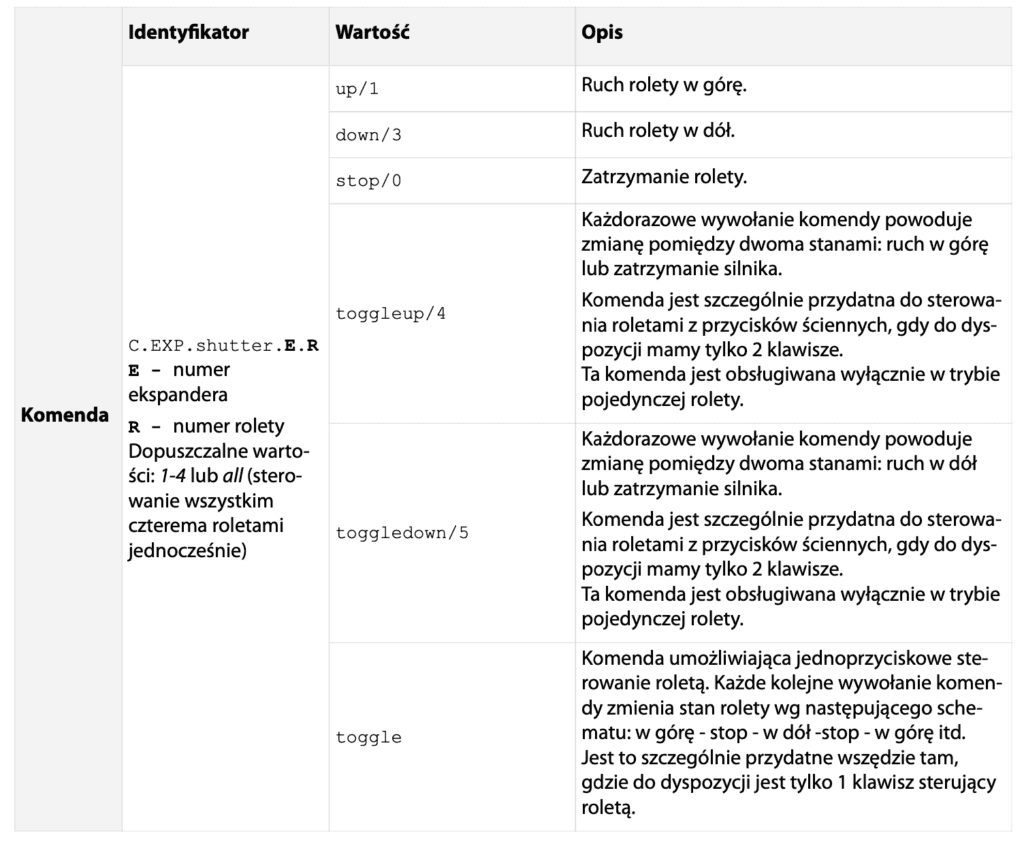 Do realizacji wszystkich rodzajów sterowania wykorzystywany jest identyfikator EXP.shutter.E.R, gdzie E to adres ekspanera INT-IORS (0-31), a R to nr rolety. Dopusz- czalne wartości: 1-4 lub all – sterowanie wszystkimi czterema roletami jednocześnie.