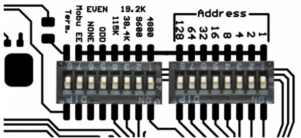 Pierwszy blok 8 przełączników (po prawej) służy do ustawiania adresu MODBUS urządzenia. Adres kodowany jest binarnie, zatem, gdy chcemy np. ustawić adres 26, wówczas należy przełączyć na ON przełączniki nr 2, 4 i 5.