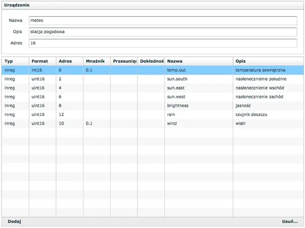 elsner_p03.xml. Po poprawnym imporcie, urządzenie pojawi się na liście. - Uzupełnij pola Nazwa (bez polskich znaków i spacji) oraz Adres (wg ustawień mikroprzełączników na płytce stacji pogodowej).