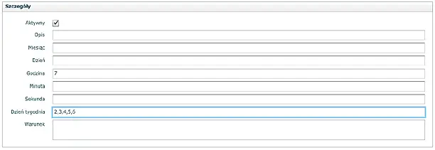 Wykorzystując zdarzenia czasowe możesz utworzyć muzyczny budzik. Wystarczy, że zdefiniujesz timer, który o określonej godzinie w wybrane dni tygodnia odtworzy ulubioną playlistę lub radio. Poniżej przedstawiamy definicję reguły, uruchamiającej playlistę w dni powszednie o godzinie 7 rano.