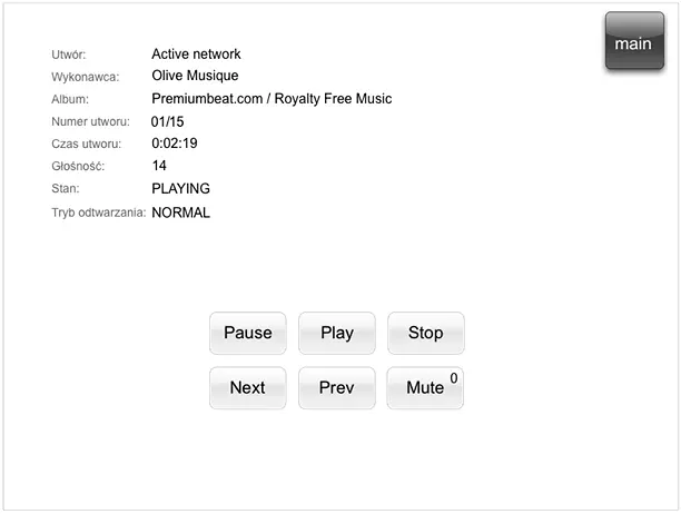 Korzystając z funkcji integracyjnych opisanych w rodziale 2. można utworzyć prosty interfejs sterujący odtwarzaniem i wyświetlić najważniejsze informacje o odtwarzanym utworze lub stacji radiowej.